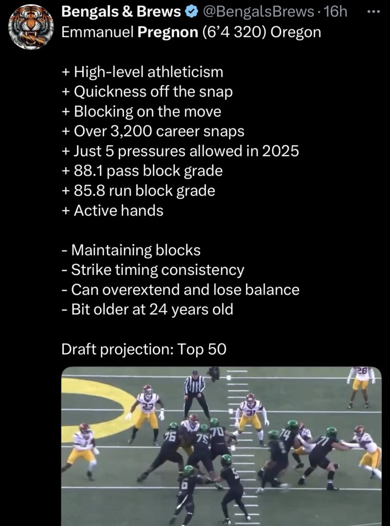 Pregnon was phenomenal at guard this season, and truthfully, there is a very real chance he will not still be available at 42. But in mock after mock, he continues to slide, and if that happens on draft night, the Saints should sprint to the podium.